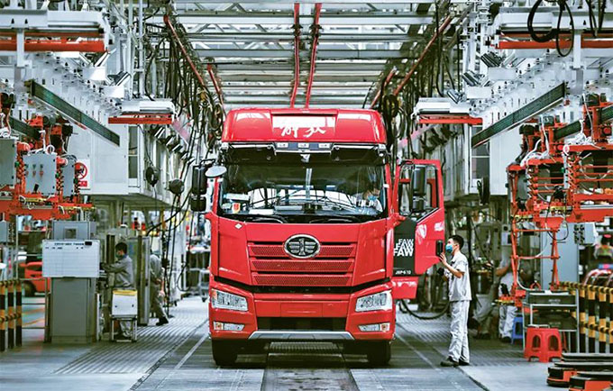 企業(yè)強(qiáng)則國(guó)家強(qiáng),加快建設(shè)世界一流企業(yè)是全面建設(shè)社會(huì)主義現(xiàn)代化國(guó)家的重大任務(wù),是新時(shí)代國(guó)有企業(yè)的戰(zhàn)略目標(biāo)。近來(lái),一汽解放集團(tuán)股份有限公司生產(chǎn)按下“加速鍵”。圖為2022年6月15日,工人在位于吉林長(zhǎng)春的一汽解放總裝車間內(nèi)裝配車輛。 新華社記者 許暢/攝