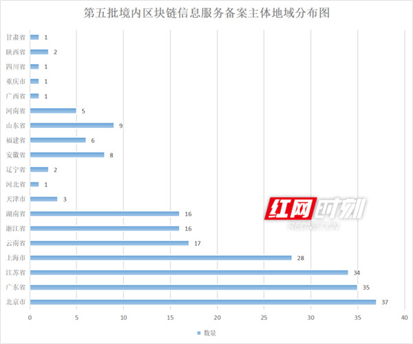 全國第五批境內(nèi)區(qū)塊鏈信息服務備案主體地域分布圖。